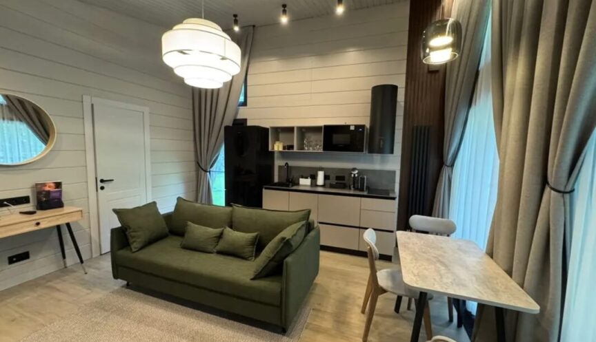 Коттеджи спроектированы в эко стиле, который гармонично сочетается с окружающей природой. В каждом доме есть всё необходимое для комфортного проживания: две спальни, кухня, объединённая с элегантной гостиной, и уютная веранда, где можно наслаждаться утренними пейзажами. Для тех, кто любит готовить, дома оснащены современной кухней.
