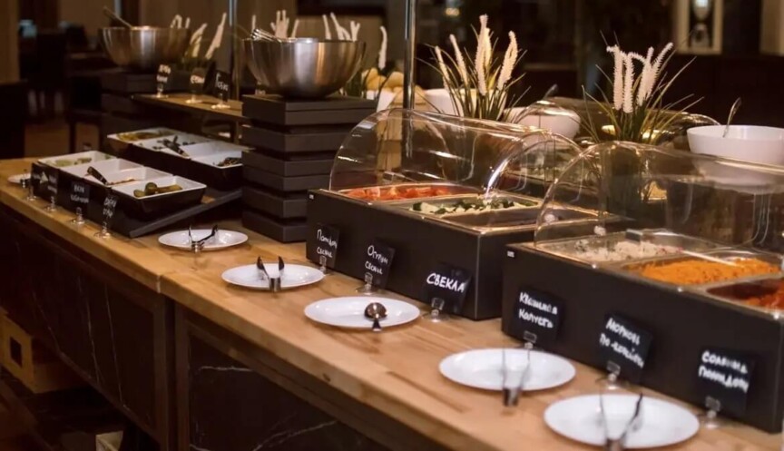 Шведский стол накрывается в просторном зале ресторана отеля Воздвиженское, который вмещает до 350 человек. Справа от входа расположена «Шведская линия», где представлены разнообразные блюда, а в центре зала — множество уютных столиков. Слева, у больших окон, находится бар, где можно заказать алкогольные напитки во время еды.